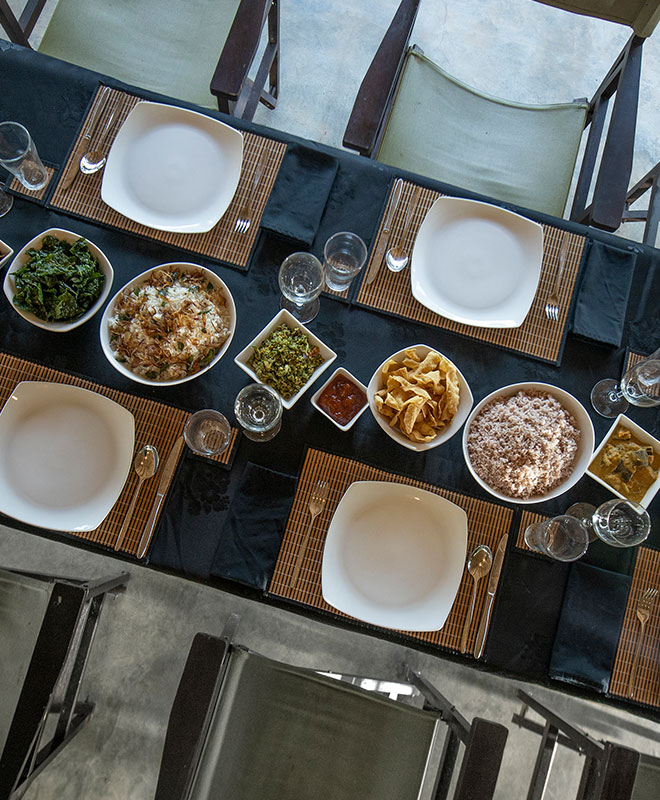 Begin your stay with a culinary journey like no other at Ceylon Wild Safaris, where every meal is a celebration of Sri Lanka’s rich flavors and vibrant culinary heritage. Our chefs craft exquisite dishes using the freshest locally sourced ingredients, tantalizing your taste buds with an explosion of taste and aroma. From traditional Sri Lankan delicacies to typical bonfire bites, each dish is blessed with authenticity, served against the backdrop of the wilderness. Whether you’re dining under the stars or indulging in a cozy meal by the campfire, our culinary experiences promise to delight.